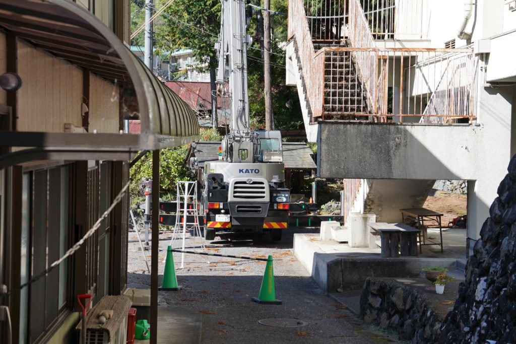 現場は入り組んだ路地の奥にあり、大型のクレーン車の進入は困難を極める場所でした。社長の佐藤さんは、この難所において、杉をワイヤーロープで固定し、高所から職人さんが順に幹を切り、クレーンで慎重に下ろすという普段なかなか見られない迫力ある作業でした。