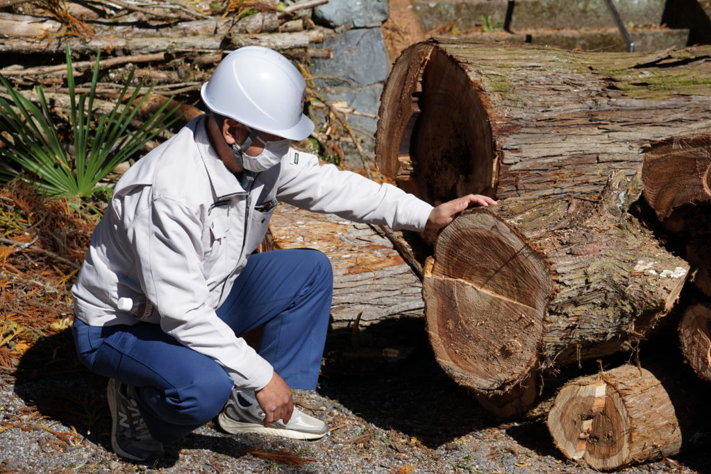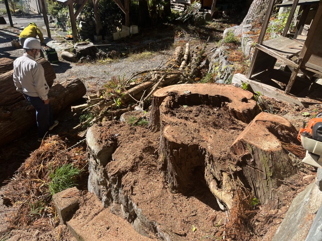 今回伐採された杉の巨木は、その悠久の時を思わせる一方で、内部の朽ちが進行し、シロアリの被害を受けてほぼ土状になっていることが事前の調査で判明していました。そのまま放置すれば、周辺の住宅街や隣接する小学校の体育館に倒れる危険性が非常に高い状態でした。