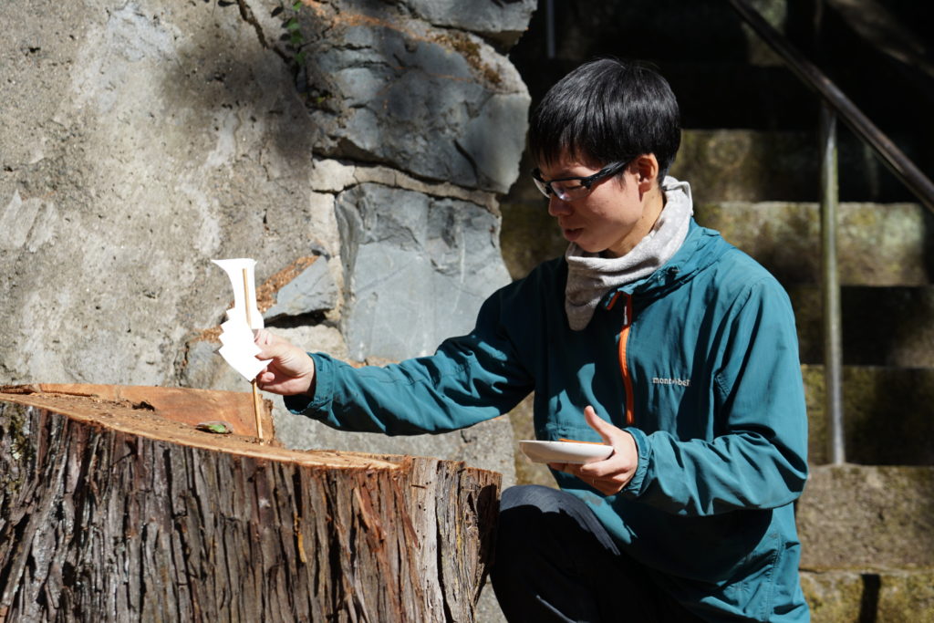 作業の締めくくりには、TreeLumberの佐藤社長が、切株の上に御幣(ごへい)を立て、その周りにお米を撒いていました。この行為は、木として生涯を終えた杉の魂や、山仕事の安全を見守る山の神への感謝と畏敬の念を示すものです。