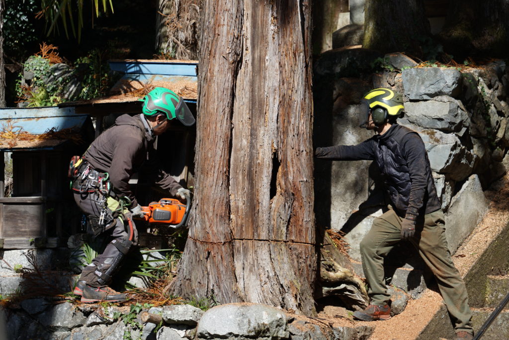 作業終盤、最も太い根元付近に巨大なチェーンソーの刃が入れられる様子は、長年の経験と技術に裏打ちされたプロフェッショナルとしての姿がありました。