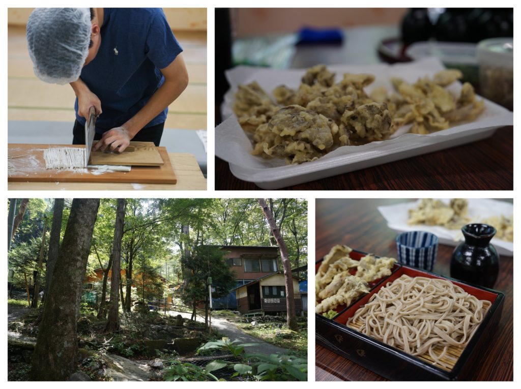 山から戻った後、甲武キャンプ村のオーナーに「そば打ち体験に来なよ」と誘われ、図々しくも参加させていただくことに(笑)。友人も突然の体験に大喜び! 打ち立ての蕎麦は香りが強く、たまらない美味しさでした。そして、一足お先に舞茸の天ぷらまでご馳走に!肉厚で香りの強い舞茸に、友人も感動していました。